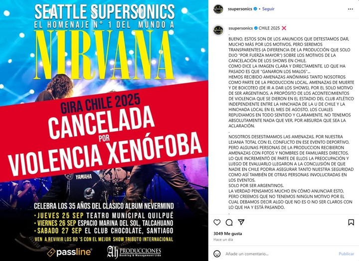Seattle Supersonics, una reconocida banda argentina que homenajea a Nirvana, se vio obligada a cancelar su gira en Chile tras recibir amenazas de muerte y boicot, en un contexto de tensiones xenófobas desatadas por graves incidentes durante un partido de fútbol entre Independiente y Universidad de Chile en Avellaneda. La banda, que tenía programados tres shows en Quilpué, Talcahuano y Santiago, denunció la situación en sus redes sociales, generando un fuerte impacto en sus seguidores y reavivando el debate sobre la violencia en las redes y el fútbol sudamericano.