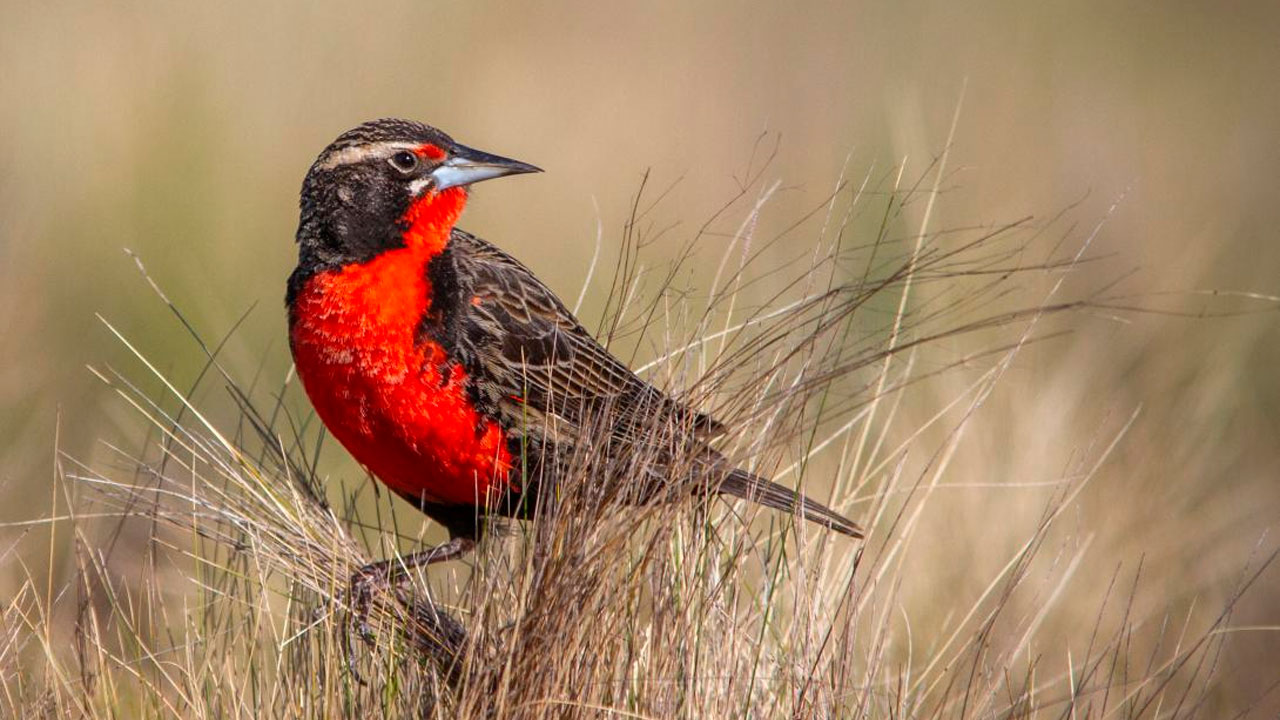 Esta ave paseriforme, conocida también como Pecho Colorado Pampeano o Tordo Pechirrojo, mide entre 20-25 cm y pesa 50-70 gramos. Los machos destacan por su pecho rojo intenso y su canto metálico, mientras que las hembras, más discretas, se camuflan en los pastizales. Habita los pastizales templados de Argentina, Uruguay y el sur de Brasil, pero el 80% de su hábitat ha sido devastado. Su temporada reproductiva (septiembre a enero) es crítica, con nidos en el suelo vulnerables a la depredación y el pastoreo. Clasificada como Vulnerable por la UICN, su supervivencia depende de esfuerzos como los de @AvesArgentinas, que incluyen protección de nidos y colaboración con productores para prácticas sostenibles.