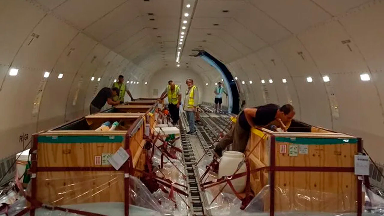 Los camiones partieron de madrugada, con paradas cada 20 minutos, hasta Ezeiza, donde los ejemplares embarcaron en un vuelo directo de Qatar Airways especialmente acondicionado.