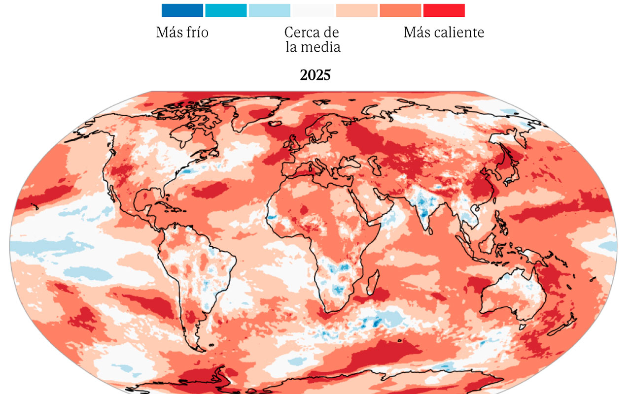 El Servicio de Cambio Climático de Copernicus, operado por el Centro Europeo de Previsiones Meteorológicas a Plazo Medio (ECMWF), ha confirmado que los últimos tres años marcan un récord histórico en temperaturas globales. Con una media de 14,97 grados Celsius en 2025 –apenas 0,01 grados por debajo de 2023 y 0,13 grados de 2024–, el planeta ha superado por primera vez en un trienio el límite de 1,5 grados por encima de los niveles preindustriales (1850-1900), un umbral clave del Acuerdo de París que nadie deseaba cruzar. Este calentamiento sin precedentes no es casual: la acumulación de gases de efecto invernadero, combinada con temperaturas excepcionales en la superficie del mar (20,73 grados, la tercera más alta registrada), ha amplificado el impacto de El Niño, un fenómeno natural potenciado por la actividad humana.