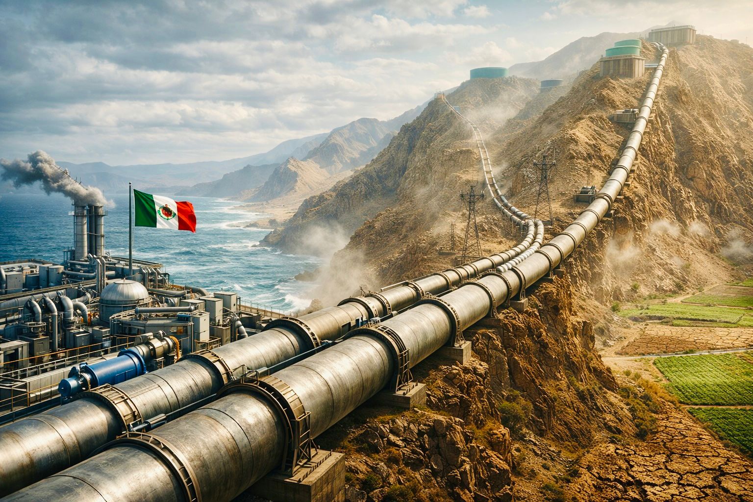 México se prepara para uno de los proyectos de ingeniería más ambiciosos del mundo: desalinizar miles de millones de litros de agua del Océano Pacífico y transportarlos a través de cordilleras y terrenos difíciles para rescatar regiones agrícolas al borde del colapso debido a la sequía y la escasez hídrica.